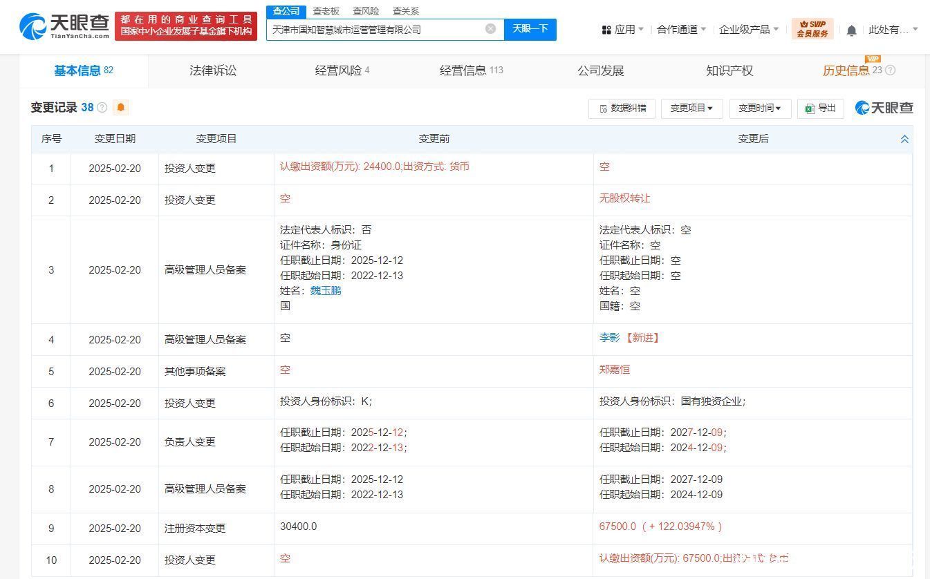 天眼查App显示,近日,天津市国知智慧城市运营管理有限公司发生工商变更,注册资本由3.04亿人民币增至6.75亿人民币,增幅约122%,同时,部分主要人员也发生变更。