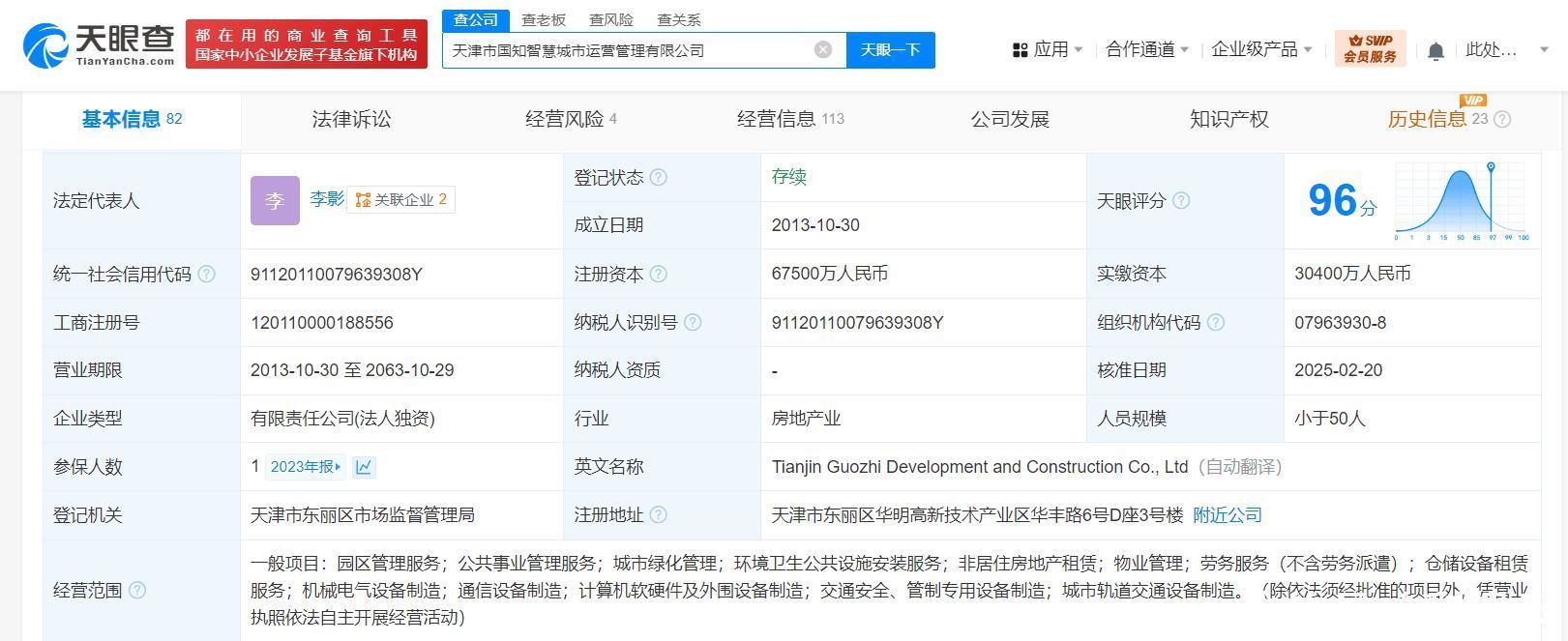 该公司成立于2013年10月,法定代表人为李影,经营范围含园区管理服务、公共事业管理服务、城市绿化管理、环境卫生公共设施安装服务、非居住房地产租赁、物业管理、劳务服务、机械电气设备制造、通信设备制造等。股东信息显示,该公司由天津市东丽区国财国有资本运营有限公司全资持股。